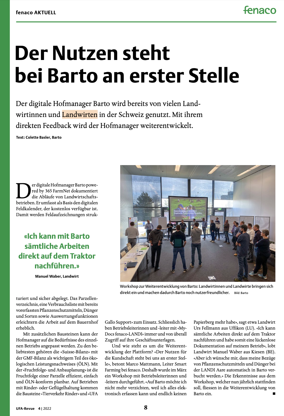 Die fenaco Genossenschaft stärkt die Schweizer Bauernfamilien mit digitalen Lösungen und macht die Landwirtschaft effizienter und nachhaltiger. Neue Barto-Bausteine von Landor und Agroline helfen beispielsweise dank digital erfassten Düngungs- und Pflanzenschutzplänen, den Aufwand zu verkleinern.