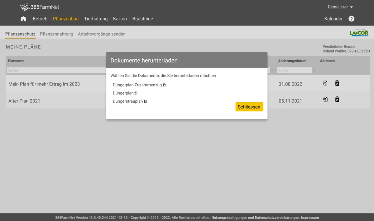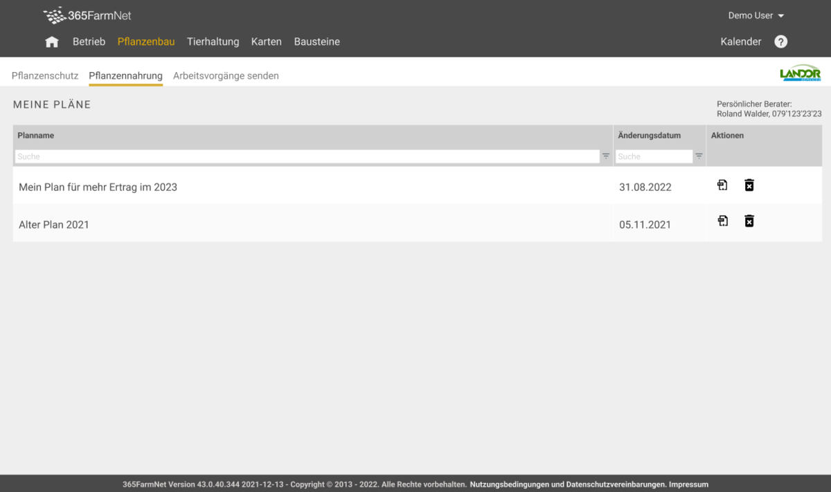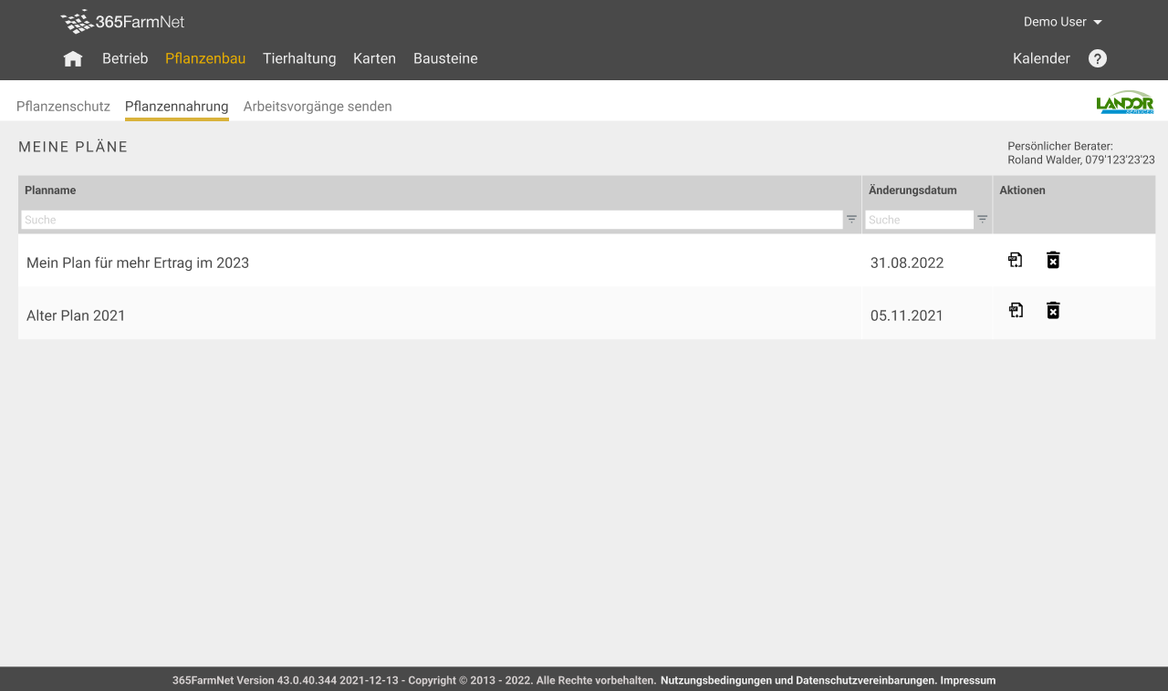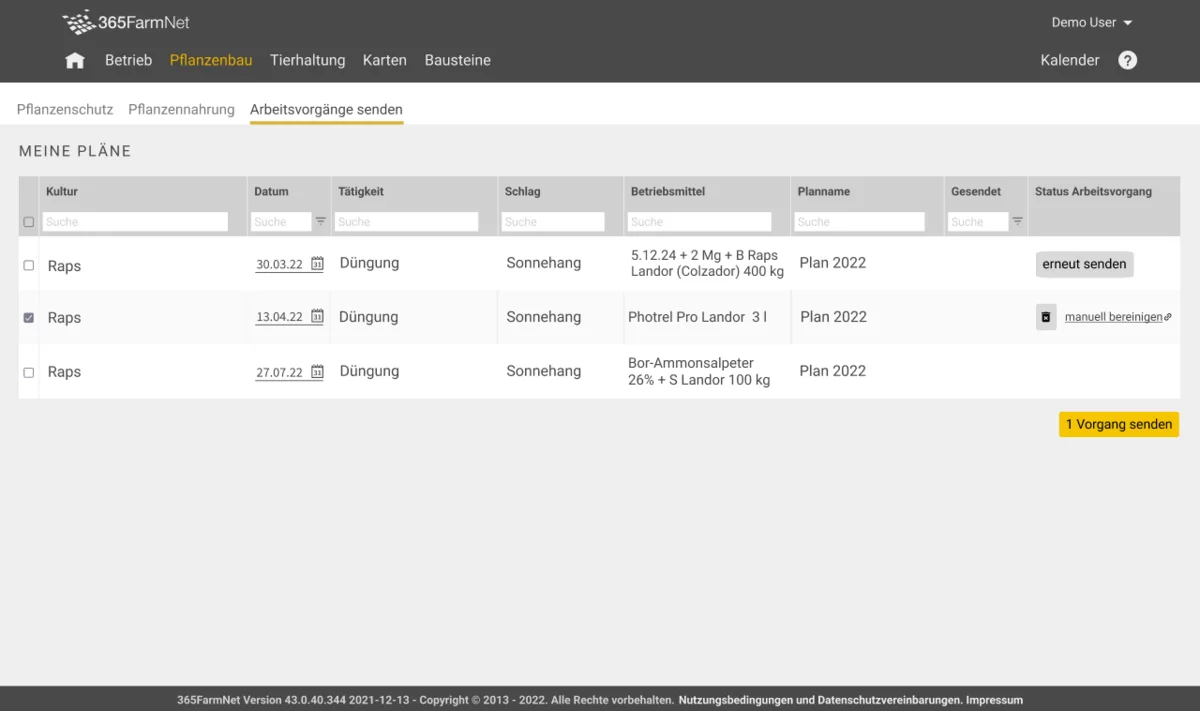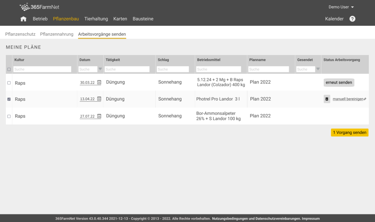 Sofern der Nutzer das Dokumentationspaket von barto gebucht hat, kann der Nutzer mit dem Partnerbaustein „LANDOR Services“ die Arbeitsvorgänge im Bereich Pflanzennahrung generieren und aufrufen sowie zur Dokumentation an die Plattform senden. Alle dem Nutzer im Rahmen der Generierung der Arbeitsvorgänge bereitgestellten Angaben und Ergebnisse sowie die Reihenfolge der Arbeitsvorgänge (im Folgenden insgesamt „Ergebnisse“) sind ungefähre Schätzungen basierend auf Grundlagenwissen, Erfahrungen und Annahmen des Bausteinpartners fenaco Genossenschaft, den von der Funktion Fruchtfolgeplanung stammenden Angaben wie Schlaggrösse und Anbaufläche, den Anwendungshinweisen des Düngerherstellers sowie dem vom Bausteinpartner fenaco Genossenschaft erstellten Düngerplan. Der den Arbeitsvorgängen u.a. zugrundeliegende Düngerplan basiert auf Grundlagenwissen, der Erfahrung und den Annahmen des Bausteinpartners fenaco Genossenschaft, auf den vom Nutzer dem Bausteinpartner fenaco Genossenschaft mitgeteilten Daten, auf den geltenden Gewässerschutzauflagen und der Suisse-Bilanz sowie auf regionalen geografischen Gegebenheiten. Die Ergebnisse werden nicht automatisch aktualisiert. Für die Ergebnisse und die Reihenfolge der generierten Arbeitsvorgänge und insbesondere für deren Richtigkeit übernimmt die Barto AG nur nach Massgabe der nachfolgenden Regelungen Verantwortung. Änderungen von Rahmenbedingungen, welche nicht in den Düngerplan eingeflossen sind, müssen nachträglich durch den Nutzer selbst bei den Arbeitsvorgängen berücksichtigt werden. Bei Änderungen von Rahmenbedingungen muss der Nutzer zudem die bereits gesendeten Arbeitsvorgänge im Partnerbaustein „LANDOR Services“ erneut manuell senden.