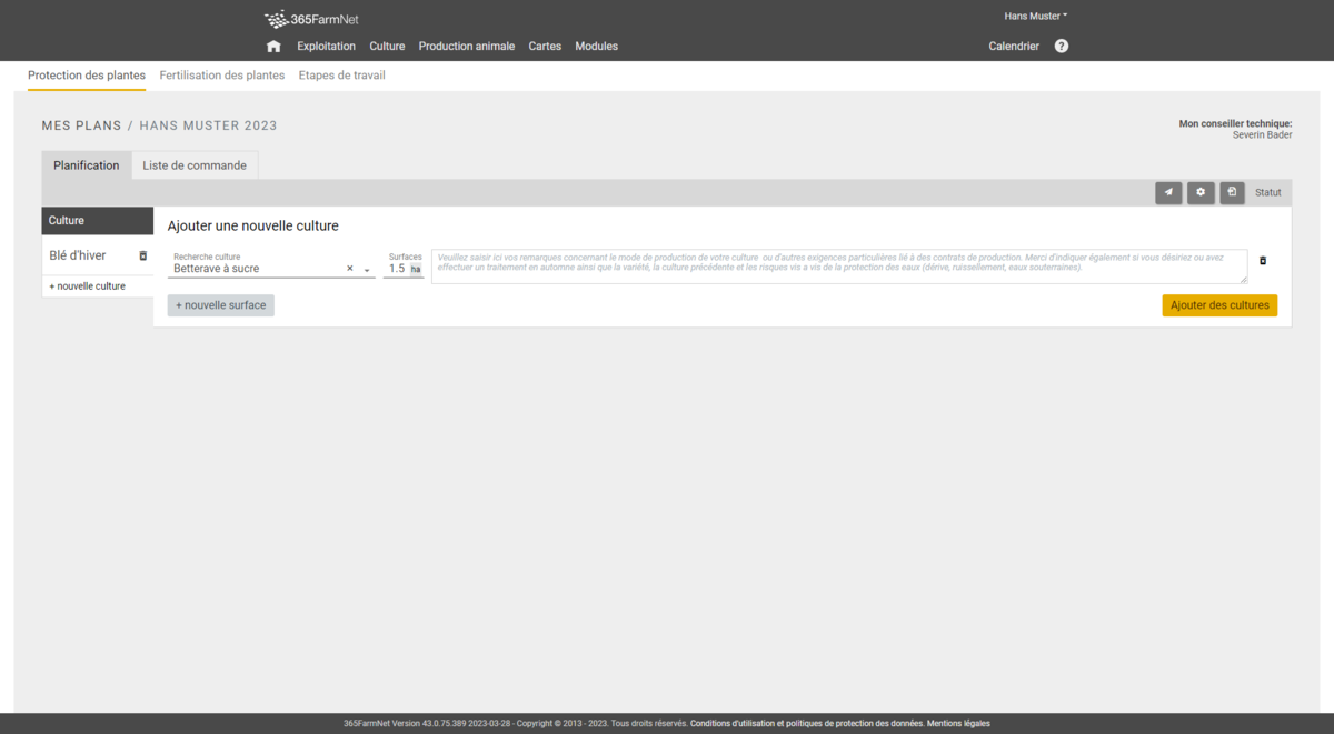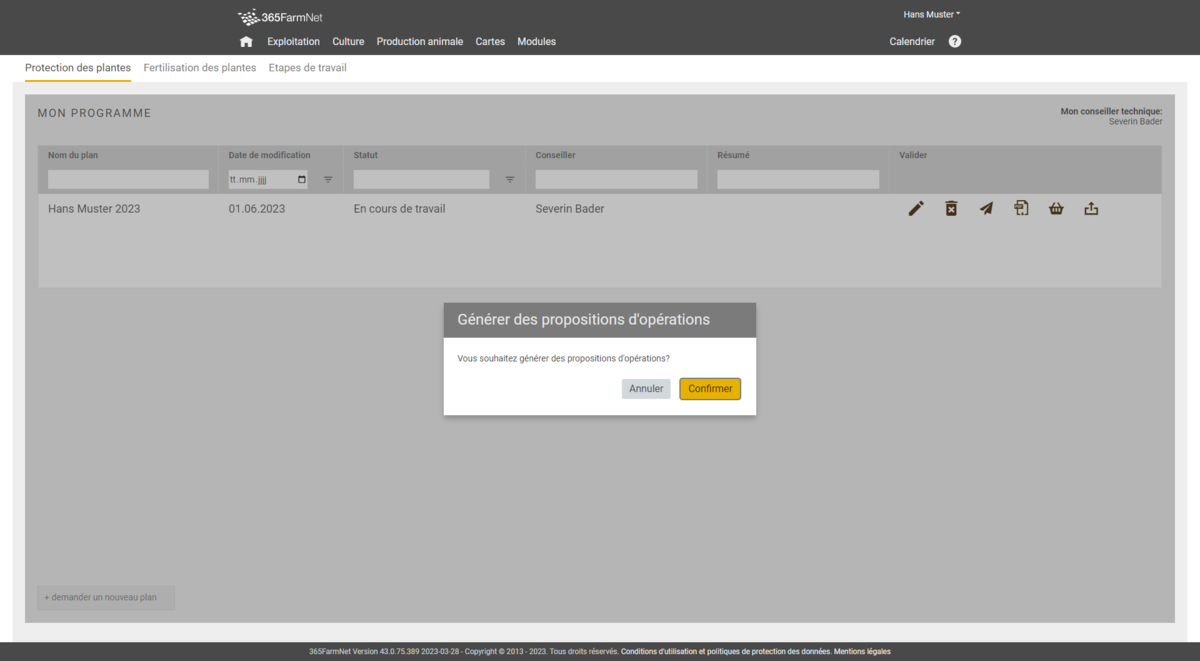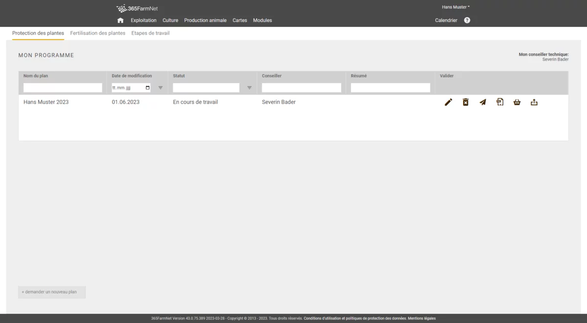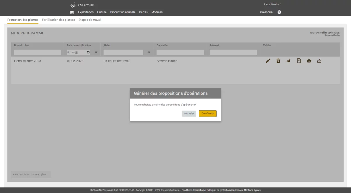 des indications d’utilisation des fabricants, des données issues de l’Index des produits phytosanitaires de l’Office fédéral de l’agriculture (OFAG) en vigueur à ce moment-là, des modèles mis à disposition par le partenaire de module fenaco société coopérative et des conditions géographiques régionales. Les résultats ne sont pas mis à jour automatiquement. 365FarmNet n’assume la responsabilité des résultats et de l’ordre des processus de travail générés, et en particulier de leur exactitude, que dans la mesure des dispositions mentionnées ci-après. Les modifications des conditions générales qui n’ont pas été intégrées dans le plan de protection des plantes doivent être prises en compte ultérieurement par l’utilisateur dans les processus de travail. En cas de modification des conditions générales, l’utilisateur doit en outre renvoyer manuellement les processus de travail déjà transmis dans le module partenaire « AGROLINE Service ».