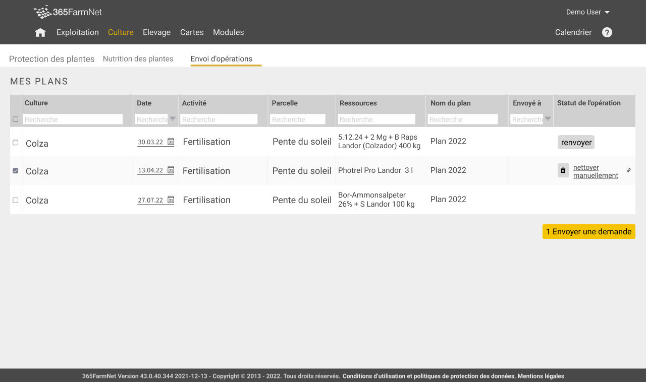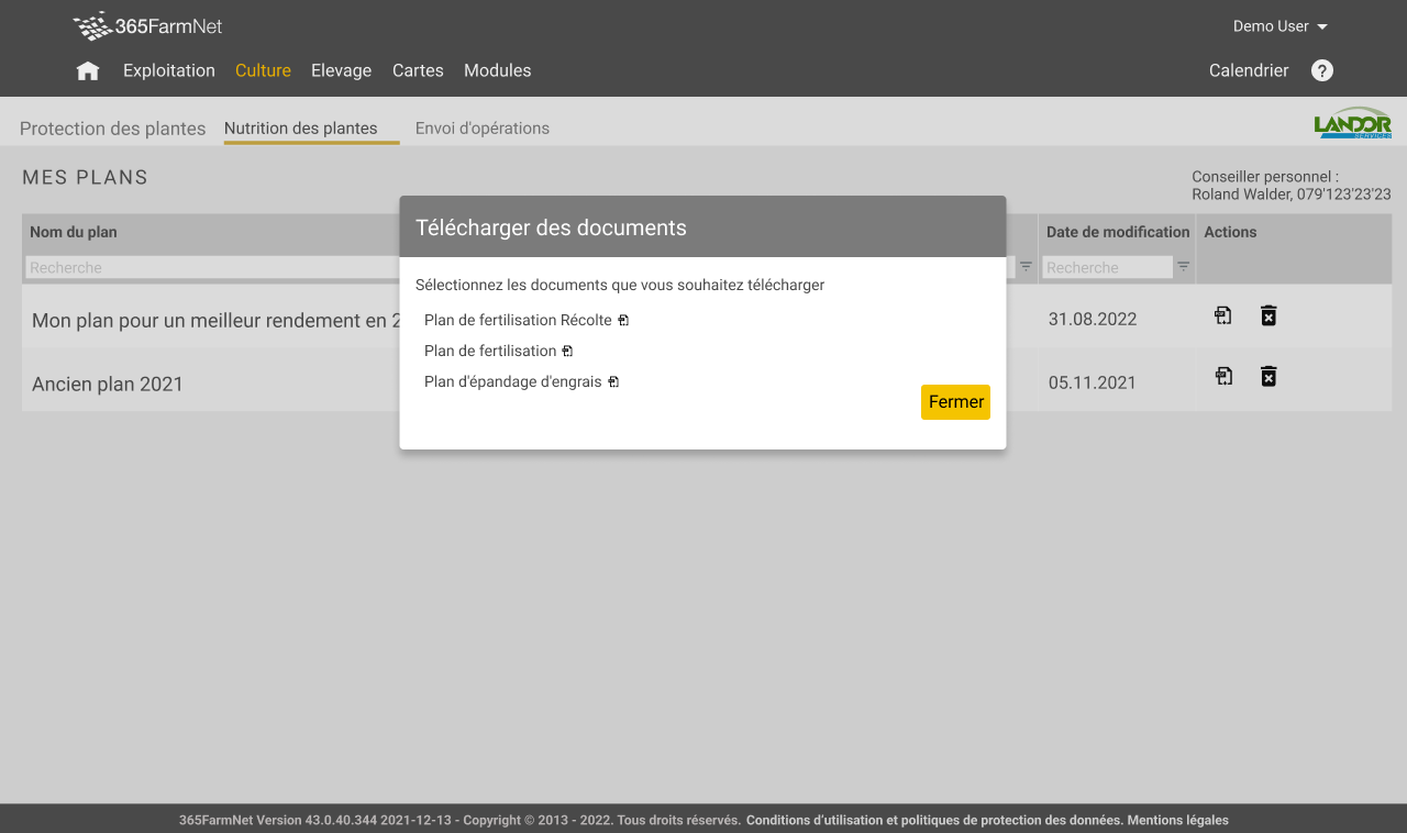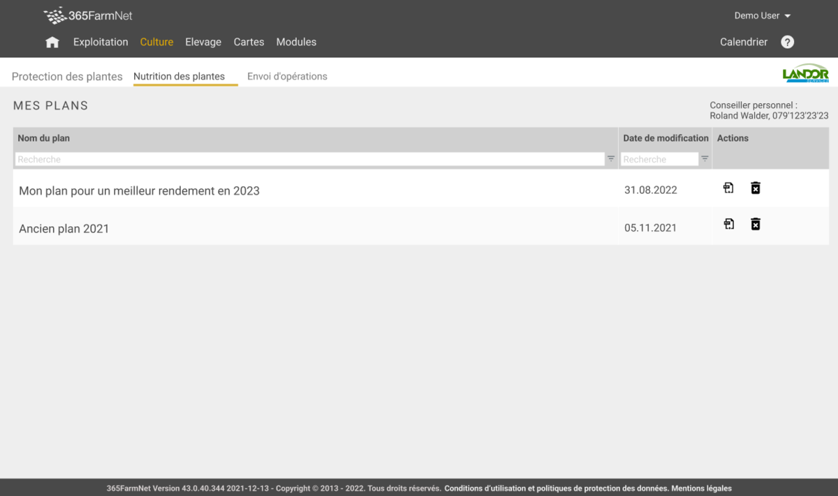 Si l’utilisateur a également souscrit au pack pour documentation de barto, il peut générer et consulter les processus de travail du domaine de la nutrition des plantes avec le module partenaire « LANDOR Services » et les envoyer à la plateforme à des fins de documentation. Tous les résultats et les indications mis à disposition de l’utilisateur dans le cadre de la génération des processus de travail et de leur chronologie (ci-après dénommés les « résultats ») sont des estimations approximatives fondées sur les connaissances de base, les expériences et les hypothèses du partenaire de module fenaco société coopérative, les données provenant de la fonction « Planification de l’assolement » telles que la taille de la parcelle et la surface cultivée, les conseils d’utilisation du fabricant d’engrais ainsi que le plan de fumure établi par le partenaire de module fenaco société coopérative. Le plan de fumure dont découlent les processus de travail s’appuie sur les connaissances de base, l’expérience et les hypothèses du partenaire de module fenaco société coopérative, sur les données communiquées par l’utilisateur au partenaire de module fenaco société coopérative, sur les exigences en vigueur en matière de protection des eaux et sur le module Suisse-Bilanz ainsi que sur les conditions géographiques régionales. Les résultats ne sont pas mis à jour automatiquement. barto AG n’assume la responsabilité des résultats et de l’ordre des processus de travail générés, et en particulier de leur exactitude, que dans la mesure des dispositions mentionnées ci-après. Les modifications des conditions générales qui n’ont pas été intégrées dans le plan de fumure doivent être prises en compte ultérieurement par l’utilisateur dans les processus de travail. En cas de modification des conditions générales, l’utilisateur doit en outre renvoyer manuellement les processus de travail déjà transmis dans le module partenaire « LANDOR Services ».