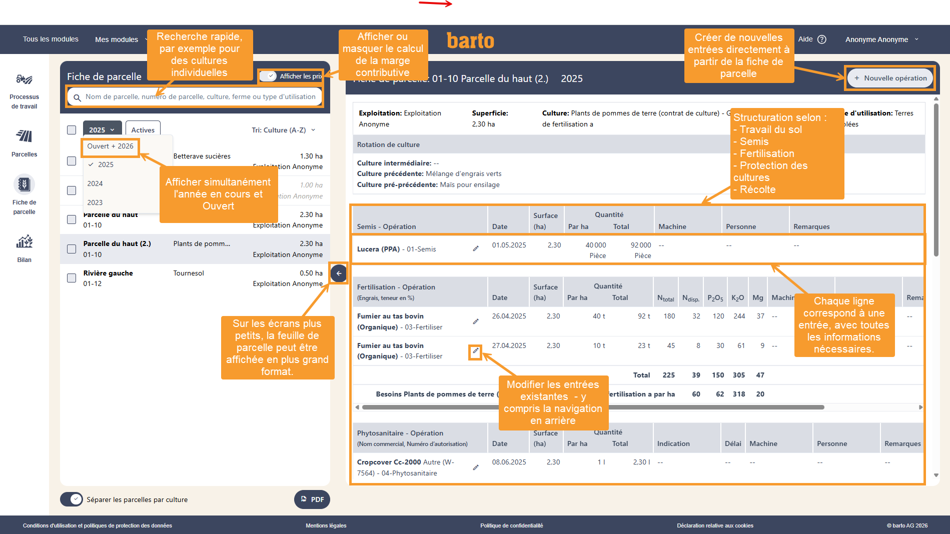 Une fiche de parcelle clairement structurée et facile à lire est l'un des éléments les plus importants du carnet des champs. La nouvelle fiche de parcelle a été remaniée en fonction des commentaires des utilisateurs de barto et t'offre désormais de nombreux nouveaux avantages.